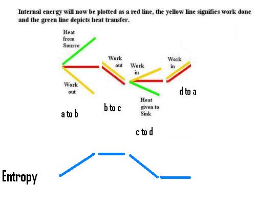 We can go up the hill by any route to get to a higher level and then return to the lower level and we have achieved our cycle. This type of behavior is common to potential energy in MECHANICS or potential energy in ELECTROSTATICS and apparently so in THERMODYNAMICS. So, the Carnot cycle gives us an ideal opportunity to introduce the topic of entropy. It has units of Joules per Kelvin for a given quantity of substance and could be added to our internal energy diagram.