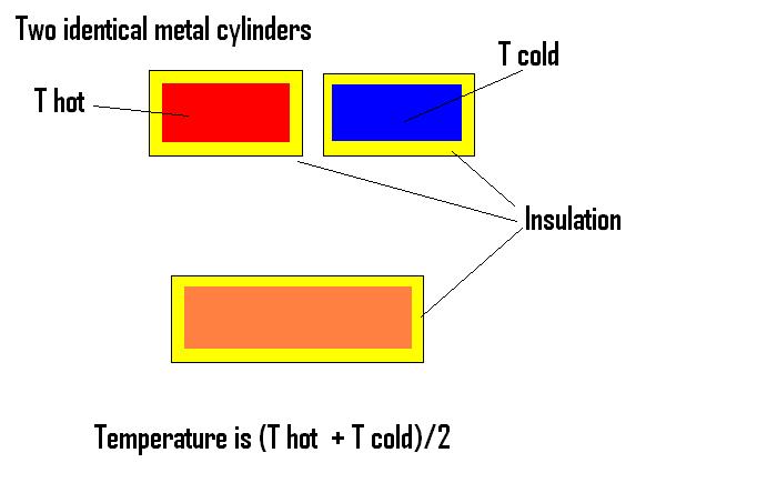 Assume that the cylinders have equal mass, m. and equal specific heats, s then it is easy to show that the internal energy ( before to after) is not changed when the cylinders are joined together --- Hot cylinder gives heat energy, Q, (= m*s*(TH - TC)/2 ) to the cold cylinder but the internal energy of the "combined" cylinder does not change. If we now calculate an entropy change we see that the hot cylinder has a negative change -Q/TH and the cold cylinder has a positive change Q/TC and so the total entropy change is Q*(TH - TC)/(TH*TC ) . At once we see that this experiment is not reversible as the entropy change is positive and yet all the other parameters have given us no indication of this.