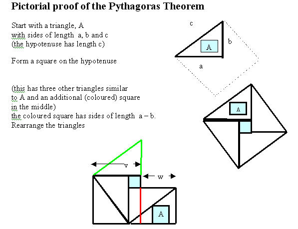 ( In algebraec terms, the proof may be directly determined from the composite square, originally drawn on the hypotenuse, given above. This square has area c2 since the hypotenuse has length c. The area can also be determined from the separate objects, namely, one small coloured square (a-b)2 and four triangles with total area 4ab/2, that is 2ab. This gives c2 = 2ab + (a-b)2 which again gives the result above. )