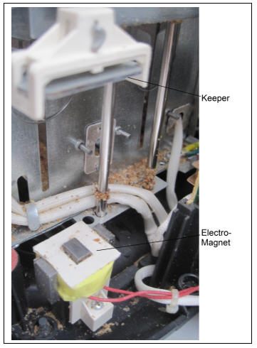 My toaster packed up recently and, as Murphy's Law is ever present, it was out of guarantee. By holding down the activation lever I discovered that all the elements were functioning normally but the lever just sprung up on removal of my hand ( there is a spring mechanism which "pops up" the toast ) . Whereas the old toasters used bi-metallic contacts to time the toasting period, the newer toasters use an electromagnet which holds a "keeper" down. Current is then passed through the electromagnet for a given time set by an electronic timing circuit. A view of the electromagnet is given in Fig 1.