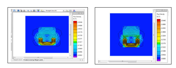 Figure 2 Magnetic Field diagrams with magnet to keeper distance varied - for simplicity a two pole magnet is presented here (produced with the QuickField simulation package).