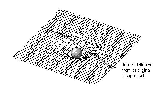 A mass at the centre of the picture will attract any other mass (even light) that travels past it; the moving mass falls down the slope, as it were. Such an elegant explanation of gravity has endured until this day and confirms that a gravitational force is always attractive as distinct from forces with magnets and electric charges where both attractive and repulsive forces occur. It is a long range force as the distortion of space essentially extends to infinity. Also, one doesn't have to worry whether this attraction is "transmitted" faster then the speed of light as it is a permanent feature in space.