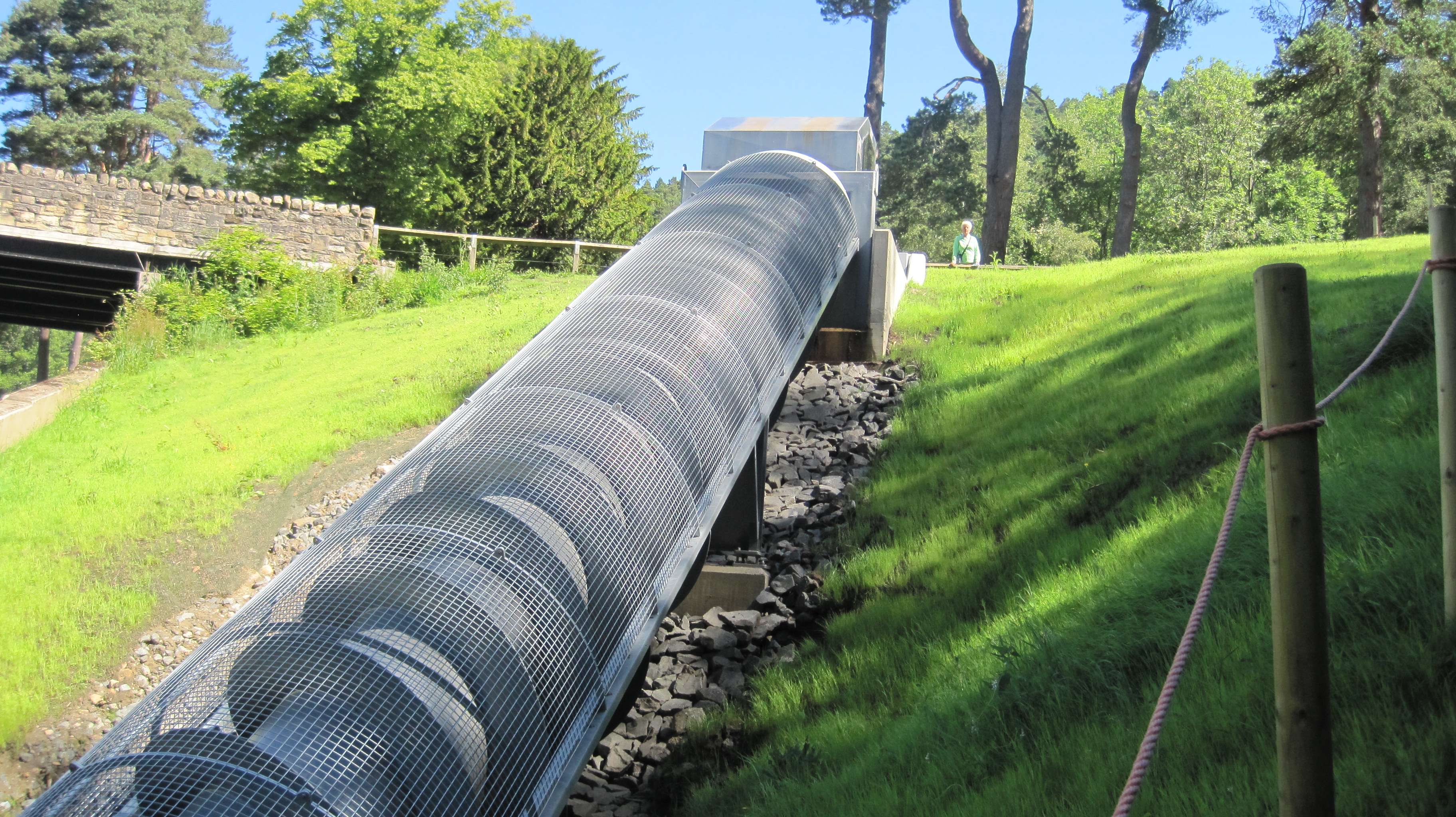 The Archimedes screw was invented thousands of years ago and used for just the opposite process of lifting water UPWARDS into irrigation channels. Only in the last ten or so years has it been used for generating power - each little segment is just like a bucket and this moves from a high level to a lower level and so produces power in the form of rotation. We need a Gear Box and a Generator and then we feed the power into the mains.