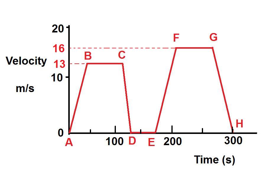 From the area under the graph we can see how far we have travelled. B-C , D - E, and F-G are regions of constant speed so the distance travelled is just the area of a rectangle ==== B - C gives 1040 m ; D - E gives zero ; F - G gives 880 m. For the other region we use the area of a triangle formula ... 1/2 base x height ... A- B gives 260; C - D gives 65; E - F gives 280 ; G -H gives 320 . So the total distance travelled is 2845 m.