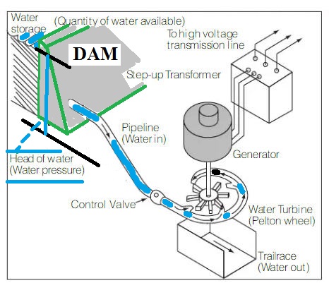 Energy and Work amount to the same thing and we all know the work comes from moving a force over a distance. Energy from water is therefore generated by a mass of water, m, falling through a height h. As above, we wrote -- force = mass * acceleration --so the potential energy is given by m * g * h . Power is simply the energy generated per second as the following diagram shows:-
