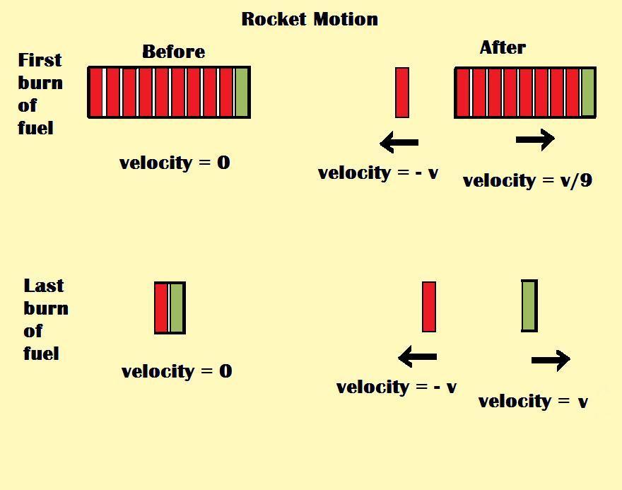 So, we can start with our new coordinates tied to the rocket/spacecraft and it is obvious that our our first diagram can be repeated and a momentum equation is again written down. As before, we draw a "before" and "after" diagram but now with a new initial mass (astronaut plus fuel is now 9*m). ----- so---- 0 = mv + 8* m*Vrocket and the rocket will move with v/8 in the opposite direction to the fuel. Now someone watching from the launch pad will see the rocket going faster as it already had a speed of v/9 so now it will have a speed of v/9 + v/8 . If this procedure is repeated, ie updating our cordinates to be with the astonaut after each impulse then all NINE fuel ejections can be covered and we find that the final rocket speed is a summation: v/9+v/8+v/7+v/6+v/5+v/4+v/3+v/2 +1*v (=2.826 * v ) as viewed from the launch pad , The correct theory gives a formula (page 166 Smith and Smith ) Vrocket = v * Natural Log ( 1 - 9/10) == 2.3026*v .