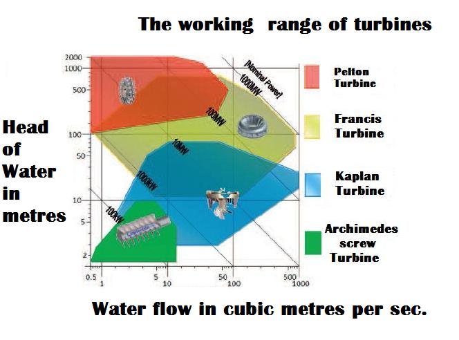 As one can see the Archimedes screw is the preferred turbine for low flows and low heads of water. Thus, all the sites in the UK where water wheels previously existed, during the industrial era of the seventeenth and eighteenth century are ideal sites for an Archimedean screw to be installed and hopefully work will continue apace to give Hydro-power a larger share of the renewable energy program.