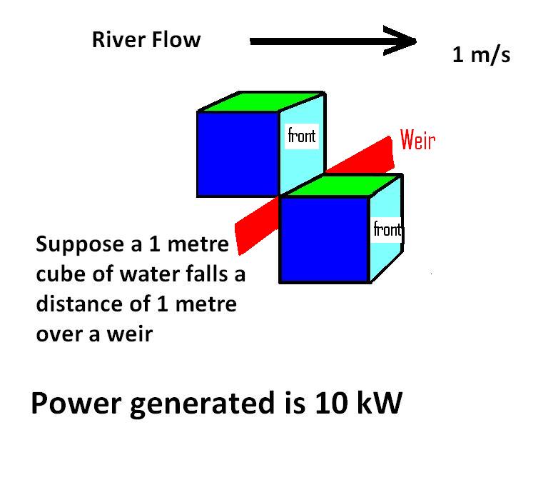 In one second the front end of the cube of water covers a distance 1m downstream from the weir and the trailing end just manages to fall over the weir. So, all the volume of water (inside the cube) falls 1 m and the mass can be calculated knowing that the density of water is 1000 kg m-3 . Also knowing that little g is about 10 we can see that the energy generated in 1 sec is 10,000 Joules which, of course, is 10 kW. In each particular installation of an Archimedes Screw the volume of water will be different -- so we can write a general equation speed (m/s)* fall (m)* width of channel (m) and then this volume is multiplied by the density (=1000 kg/cubic meter) and little g (=10). The purpose of the screw is to let the water fall in an orderly manner and convert the potential energy into kinetic energy of rotation and so "power" an electrical generator. The conversion is moderately good at 20 % to 30 %.