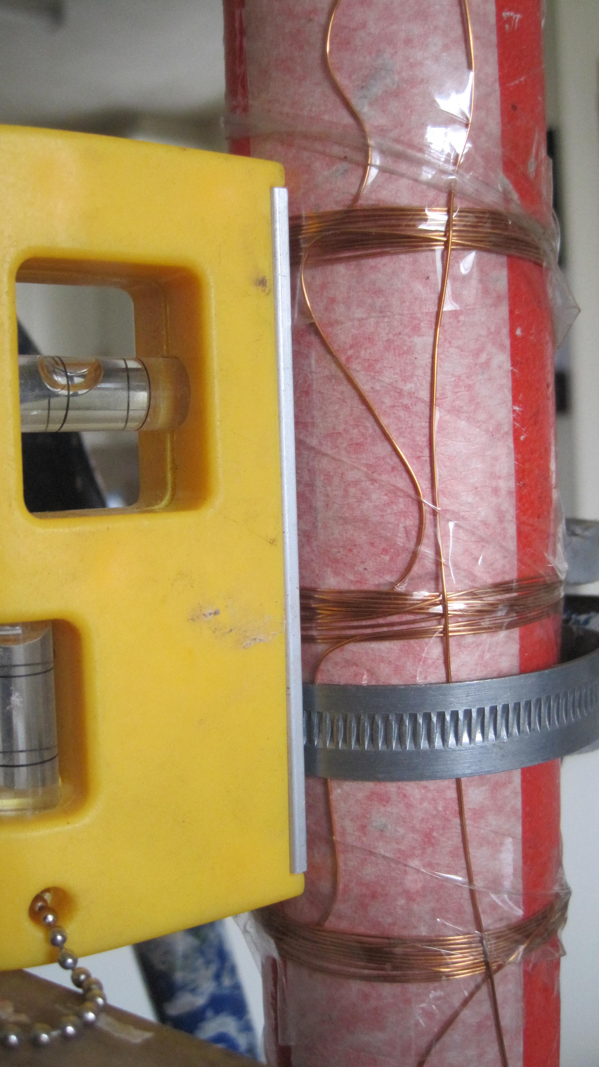 A metre long cardboard tube was used, 45 mm OD and 40 mm ID. Fifteen coils, 10 turns each, were wound on the outside and were all connected in series; the spacing was 5 cm between the centre line of the coils and an illustration of two of the coils is given.