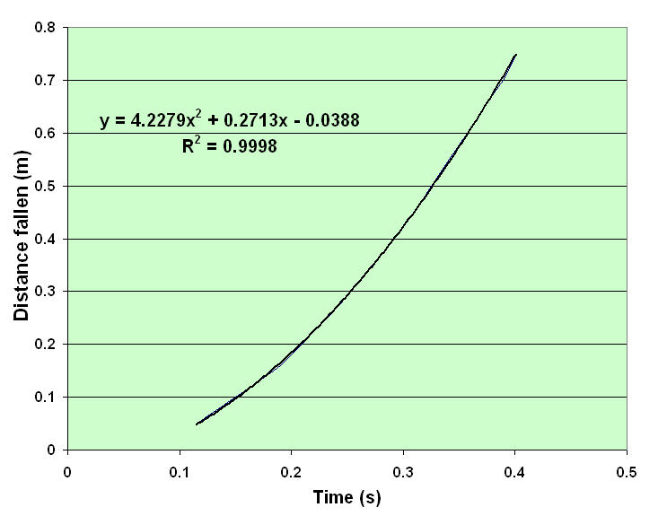 The magnet N_S poles give rise to positive and negative swings in the induced voltage and, from an EXCEL trace the times of the middle point can be determined. We know that these cossings will occur just when the magnet passes the coil so a time versus "fallen distance" of 0.05 m, 0.10 m, 0.15 m ....... can be plotted. From the laws of motion we have s = 0.5*g*t2 + u*t so the data can be fitted to a polynomial of second order.
