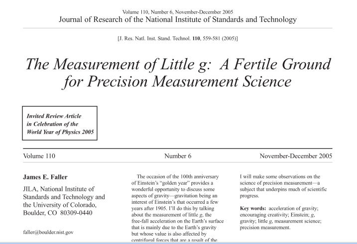 Little g is the topic of a recent review article by James E Faller at the National Institute of Standards and Technology (NIST) which covers the subject in greater detail.