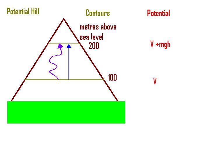 As expected, the internal energy returns to it's inital point after the cycle. If we were supplied with meters to check how the engine was changing with time we would have -- a PRESSURE meter, a meter TO MEASURE VOLUME. a THERMOMETER and an INTERNAL ENERGY meter. On each of these meters we see that the finishing point is exactly the same as the starting point provided we have carefully carried out a reversible cycle. Do we have anything else that we need to moniter? Suprisingly, the quantity Q/T also has this same property of coming back to the starting point since it has been shown that Qh/Th is equal to Qc/Tc during the cycle. In all cases the changes are very similar to mountain climbing as illustrated below.