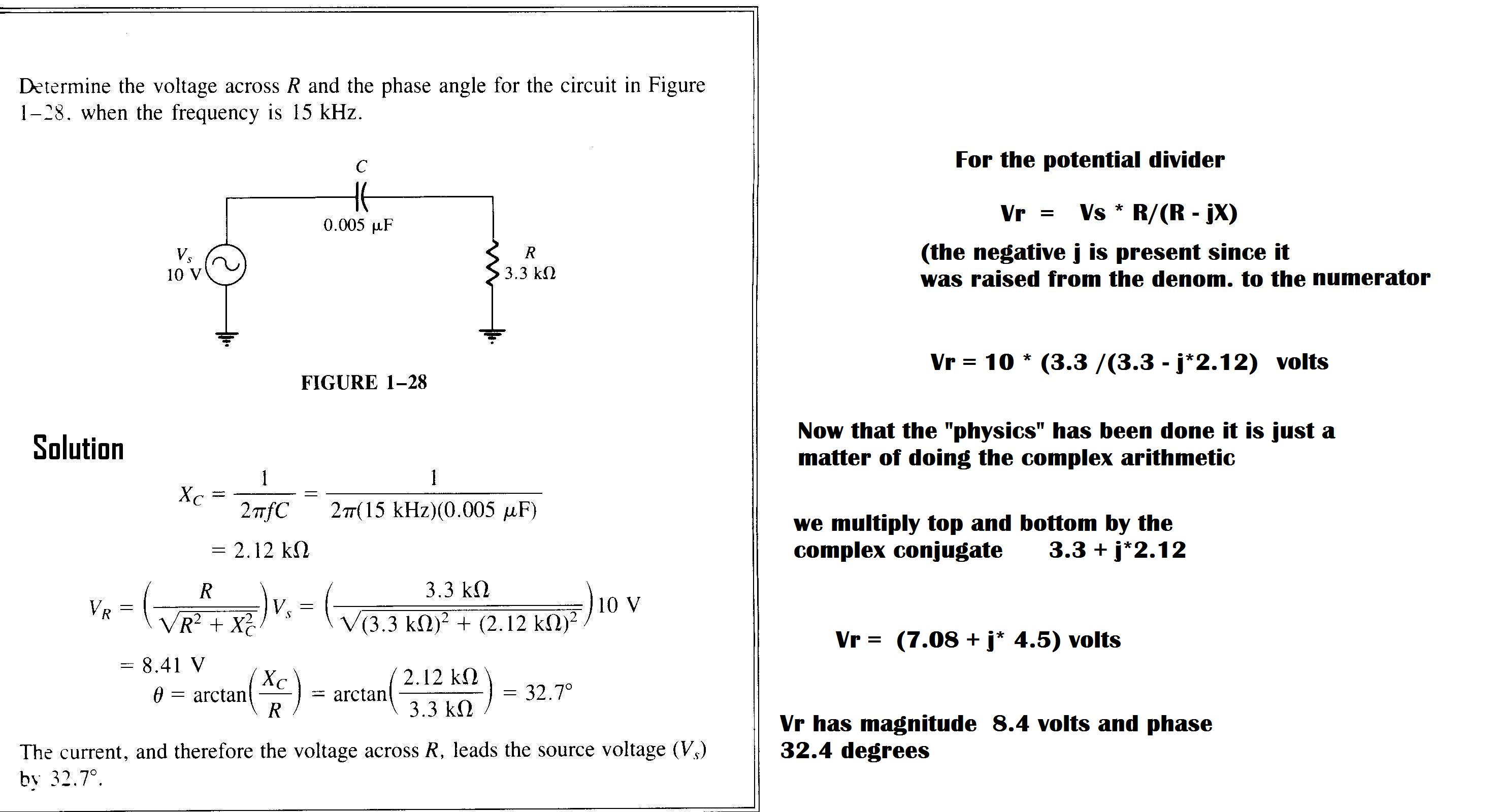 For a capacitor the impedance is given as 1/(jwC). Often textbook will mention the term "reactance, X" which has the unit of "ohms" and thus conforms more closely to resistance. For the inductance we have reactance = wL , for capacitance the reactance is 1/(wC) . A potential divider circuit will now be given: