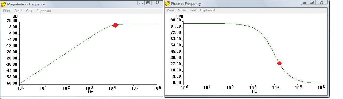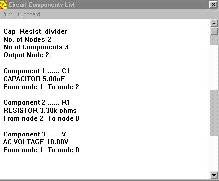 The components are entered with "values", "names" and "node positions" and then an analysis is carried out : eg a frequency scan can be made from 1Hz to 1 MHz with, say, 100 steps. The calculated data can be presented as a table or in graphics form as below:
