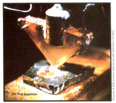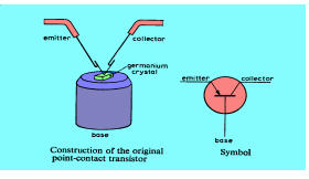 The two critical points about the transistor were (a) that it was light and robust and that it did not require a heated filament to produce electrons and therefore (b) it consumed much less power then valves. The point contact device, shown above, was a little reminiscent of the cat's whisker diode and was not 100% reliable. However, the technology of diffusing impurity atoms into semiconductors was soon developed and a third advantage could be added to characterise transistors -(c) they offered reliability. Planar diffusion processes, in which diffusion occurs at only one surface, helped to create many different forms of the transistor.