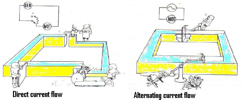 Some form of sluice gate is used to control the current which then powers a wood saw (left slide). The right hand slide shows another electrical circuit but this time there is an alternating current. Again, a sluice gate could control the current flow and a different sawing arrangement is used. This form of electricity is used in the home for lighting and heating though direct current is needed for most electronic gadgets,