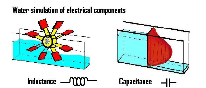 Extensive simulations have been made for all manner of electrical devices and it is worth exploring textbooks and the web. Two other electrical components are in constant use along with batteries, resistors and switches, namely, inductances (sometimes called chokes) and capacitors (sometimes called condensers). An inductance is just a coil of wire and a capacitor is two conducting plates separated by a small distance from eachother. Between the plates there is usually a dielectric material (see session 3). Water models are given below: