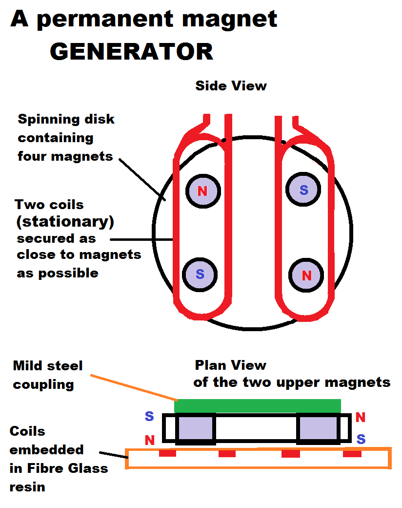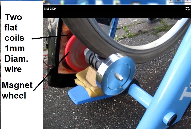 A bike generator is demonstrated with a very simple arrangment of permanent magnets and coils - Luke, my grandson, is providing the motive power.