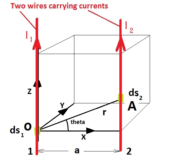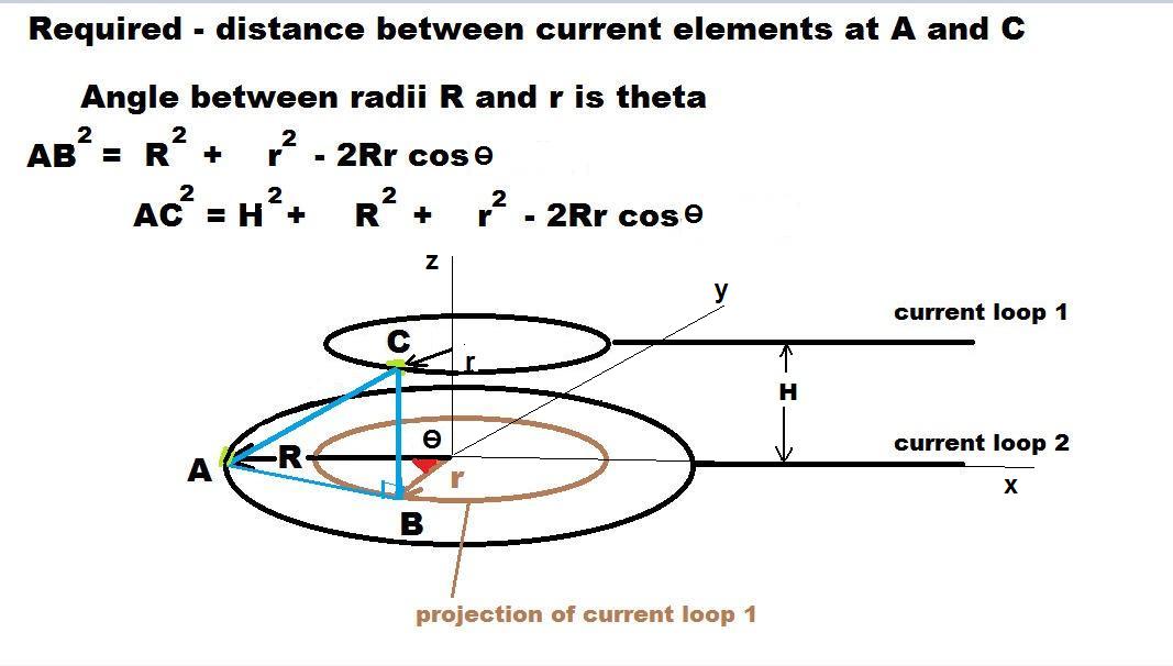 When the two wires are in the form of circular loops the same approach is taken the find the force of interaction. Current elements are chosen from each loop as indicated in the diagram