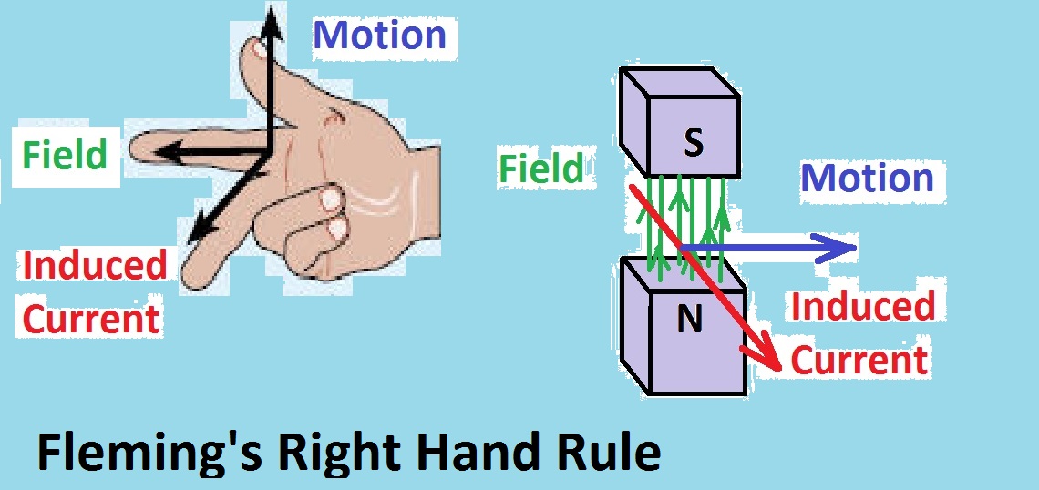The magnitude of the induced emf (electromotive force) in a circuit is directly proportional to the rate of change of magnetic flux linkage. The direction of the emf is given by Fleming's RIGHT HAND RULE as the following diagram shows