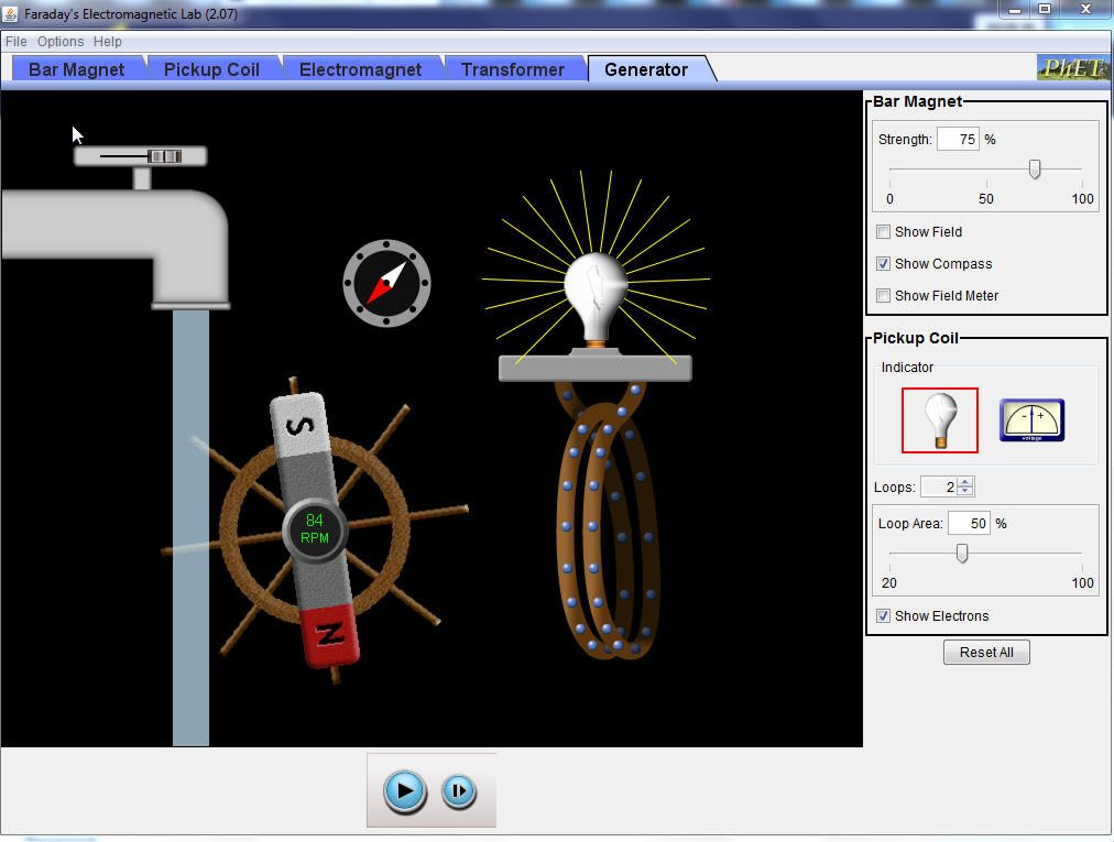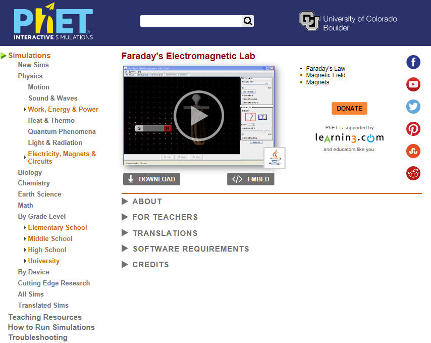 If the Colorado site is opened http://phet.colorado.edu then Faraday's Electromagnetic Lab may be selected from the Physics section. One is invited to "Play with simulations" then download and open .