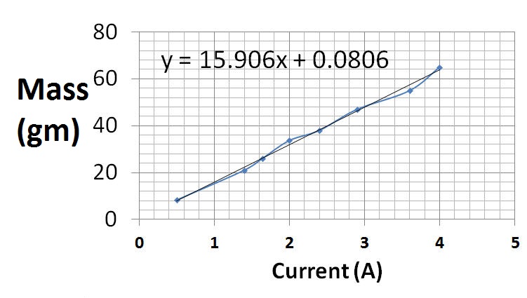Only approximate calculations, using Force = B.i.L , may be carried out as the profile of the magnetic field within the magnet is not will known. From the graph, a mass increase of 65gm is recorded for a current of 4 A. Assuming g = 10 m/s2 then the magnetic force is 0.65N. With an average value of B as 0.035 T and an approximate value of L as 3 cm (x 150 for the turns) we calculate 0.63 N for the right hand side of the equation. It is only fortuitous that good agreement is obtained since the upper part of the coil will give a repulsive force in the stray magnetic field. The graph shows that there is a linear relationship between current and force as expected.